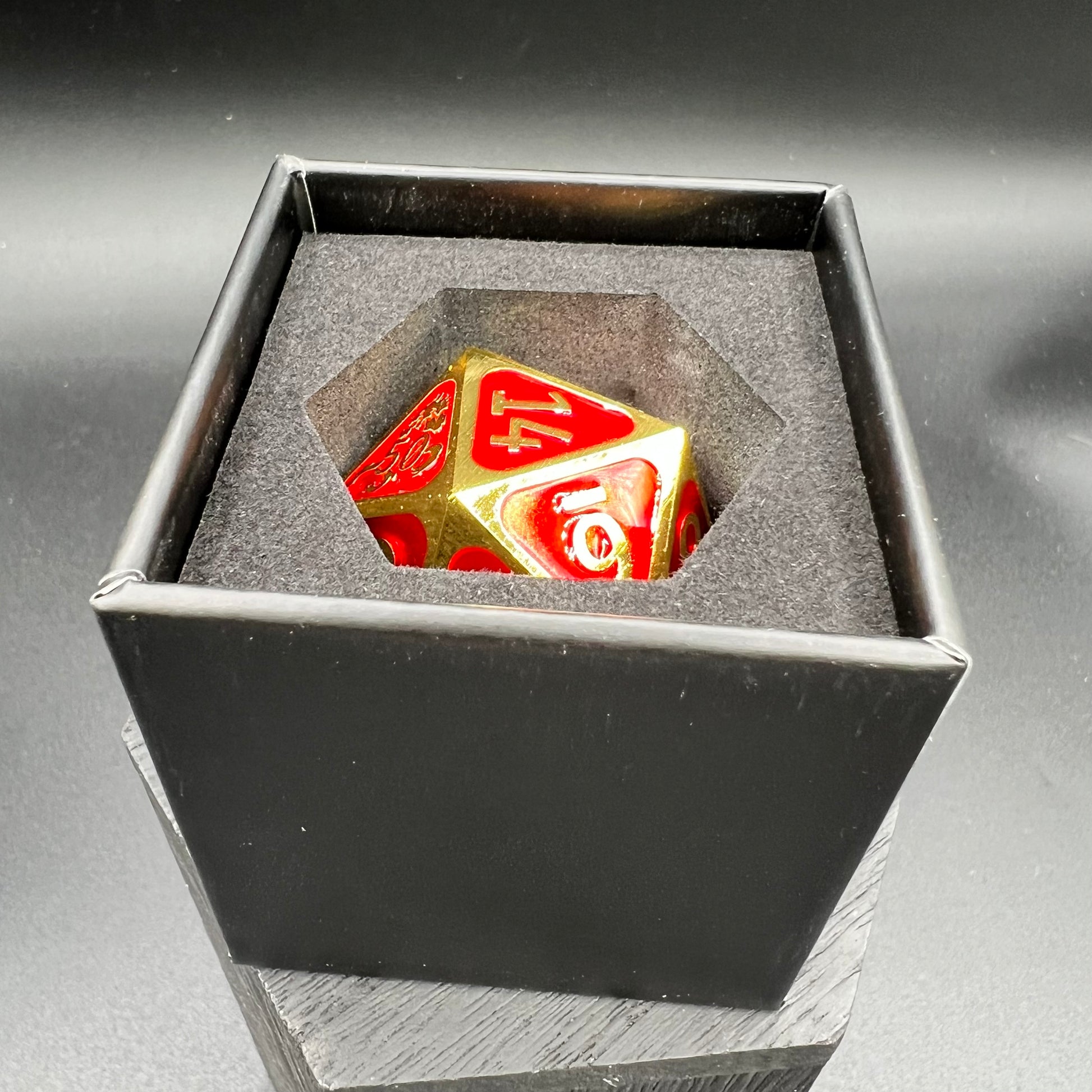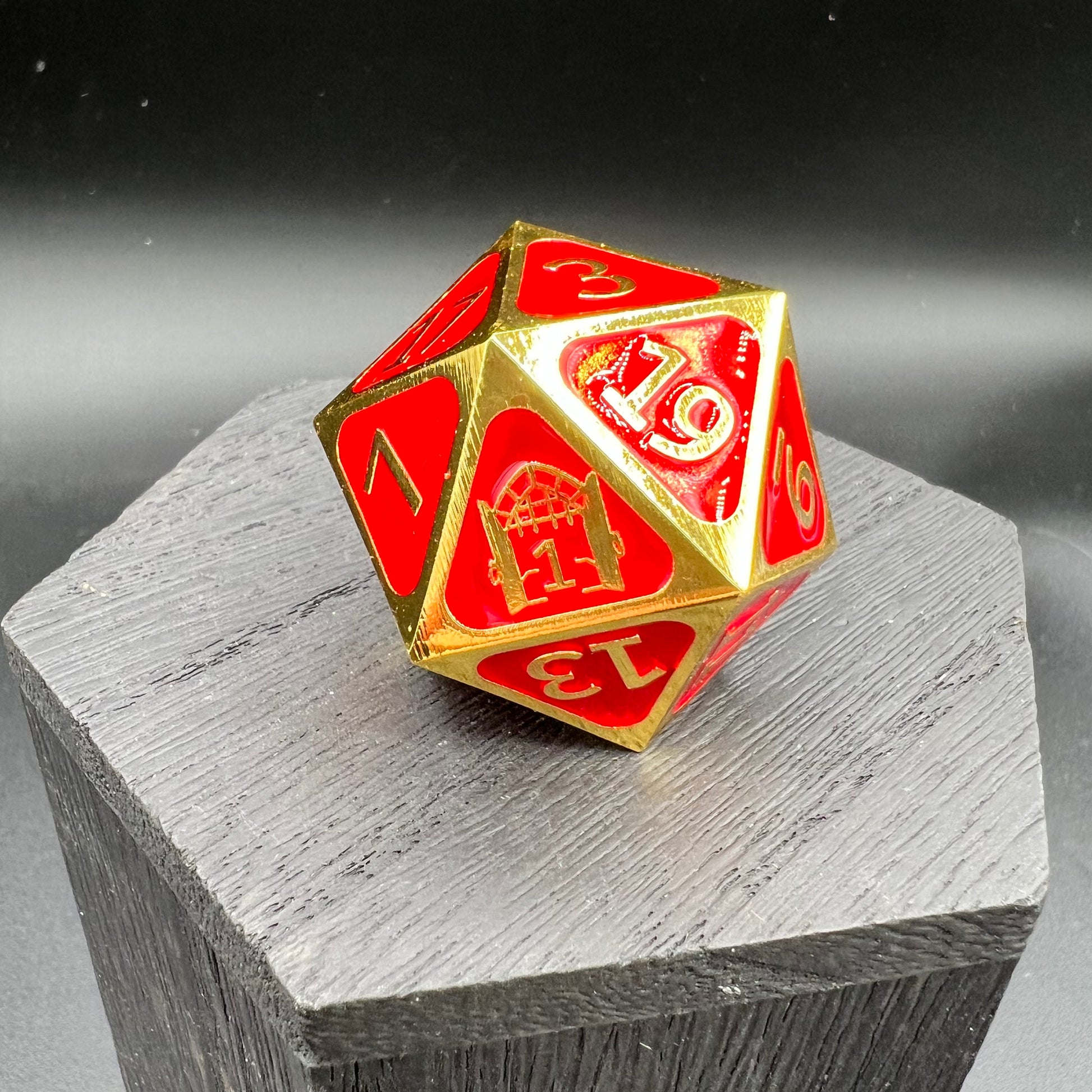 This oversized 33mm D20 features a 50th Anniversary logo on the 20, a dungeon on the 1, and comes in a box