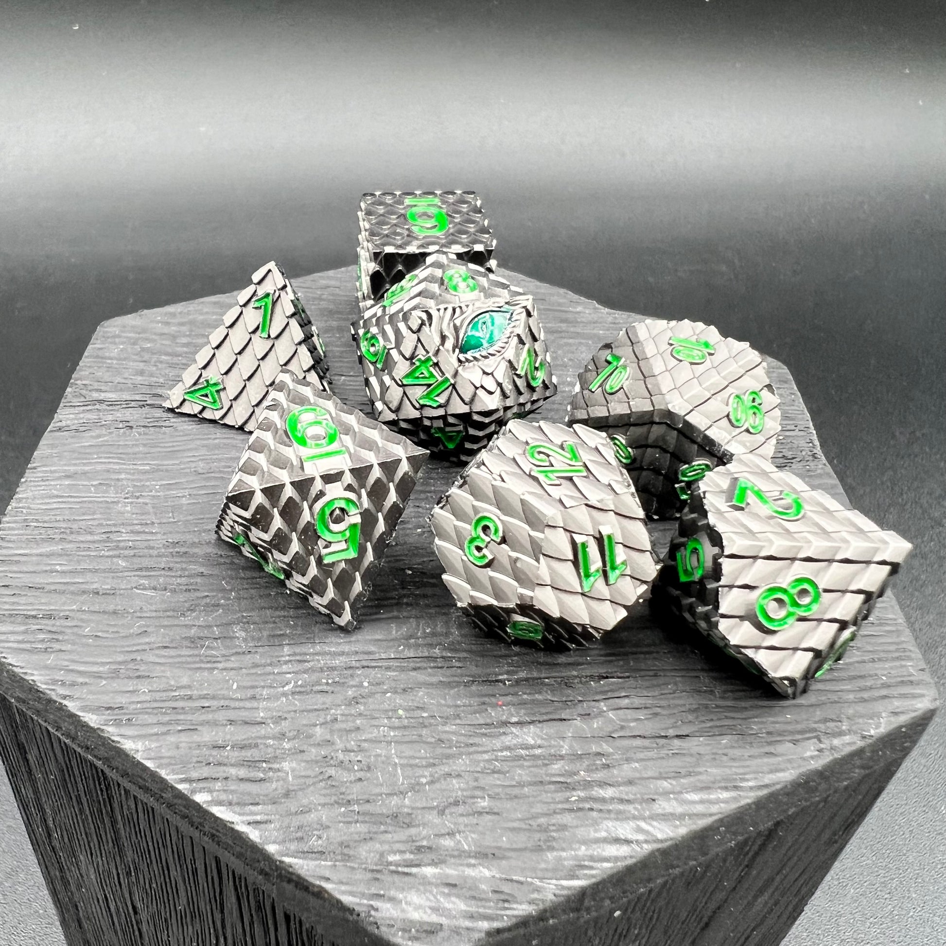 Our premium zinc alloy metal is precisely crafted into a high-relief dragon scale texture with a striking eye on the d20. Bold numerals make these easy to read during your intense battles!