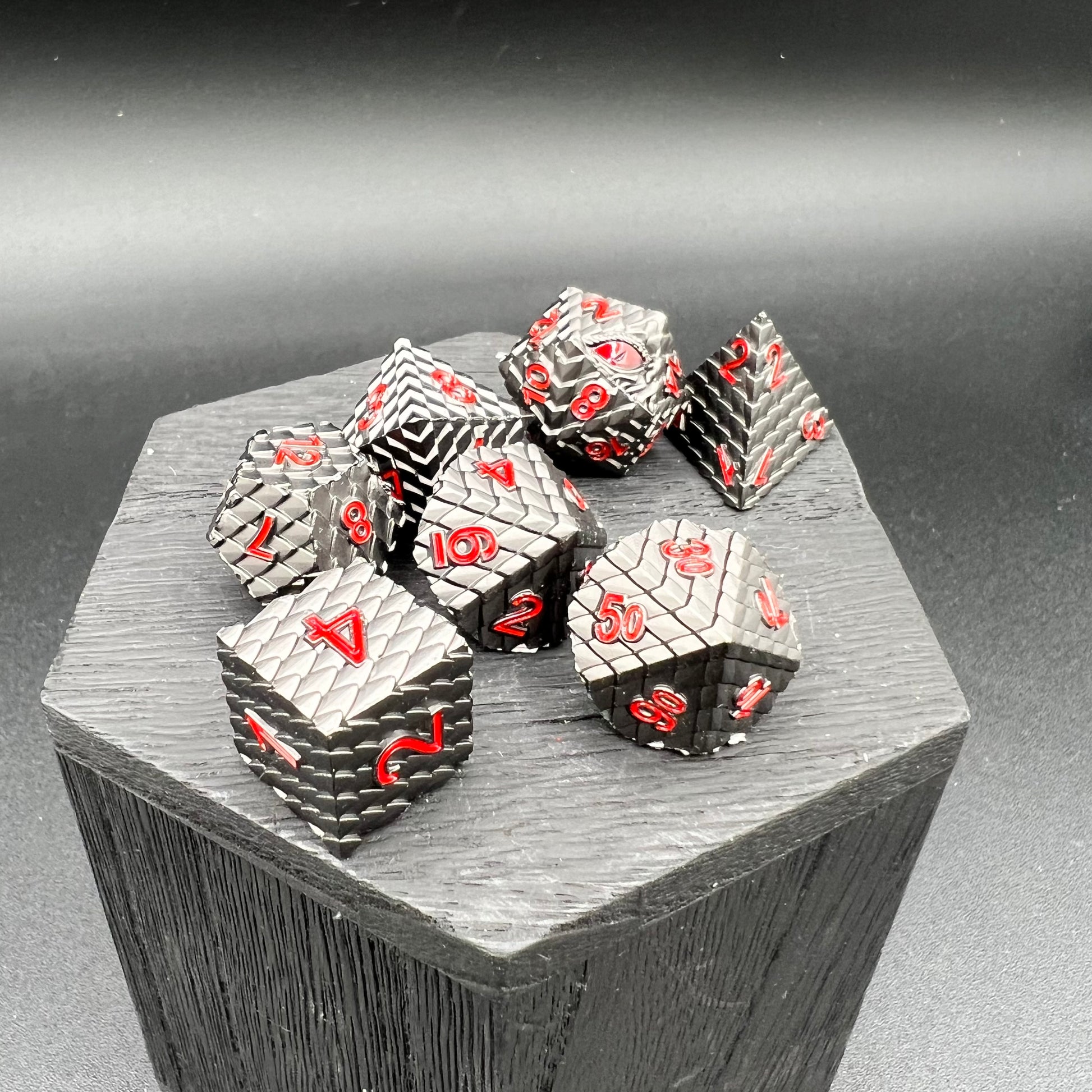 Our premium zinc alloy metal is precisely crafted into a high-relief dragon scale texture with a striking eye on the d20. Bold numerals make these easy to read during your intense battles!