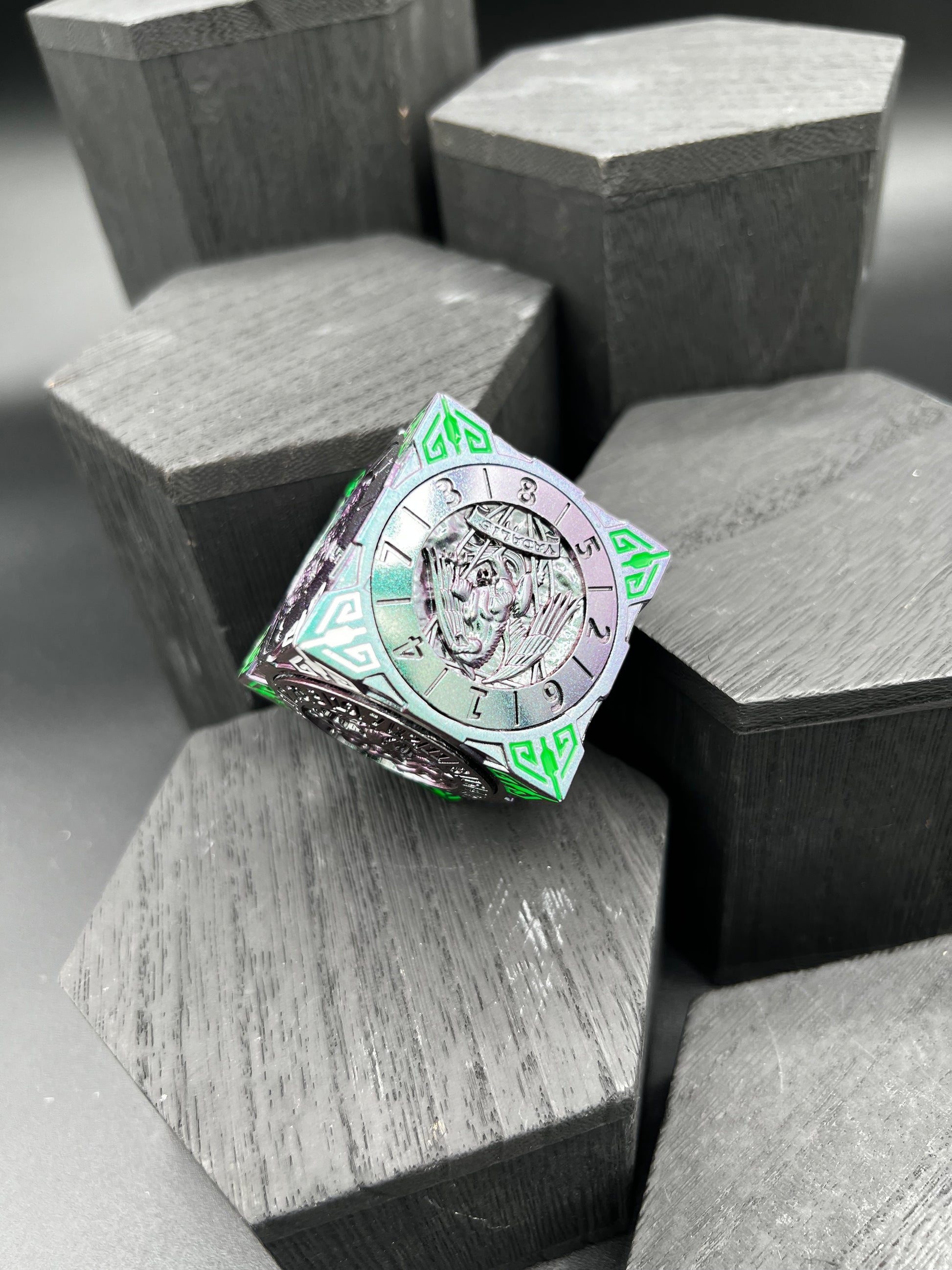 6 sides, 6 dials. Each face is a different standard D&D die, with the % and d10 sharing.