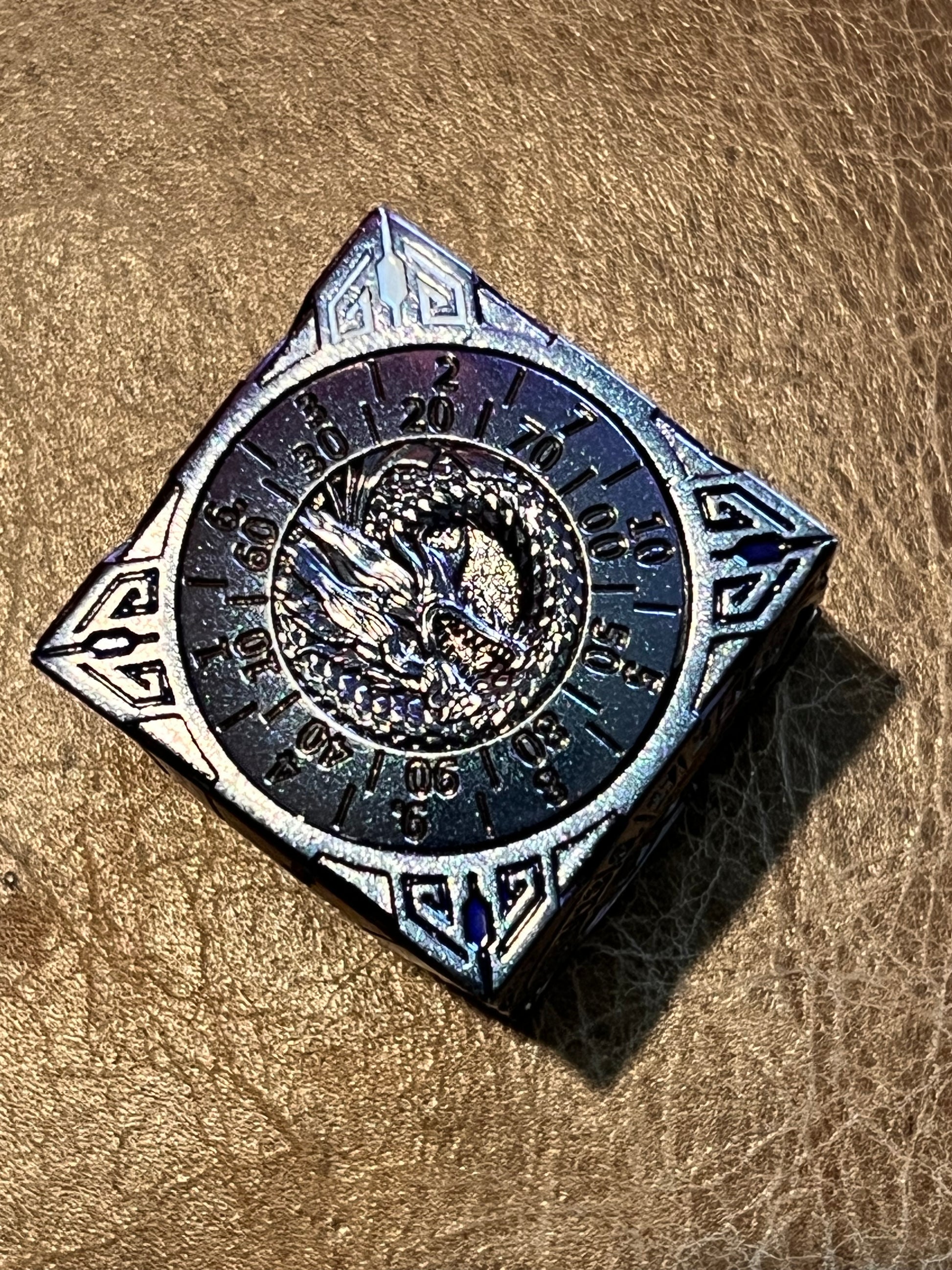 6 sides, 6 dials. Each face is a different standard D&D die, with the % and d10 sharing.