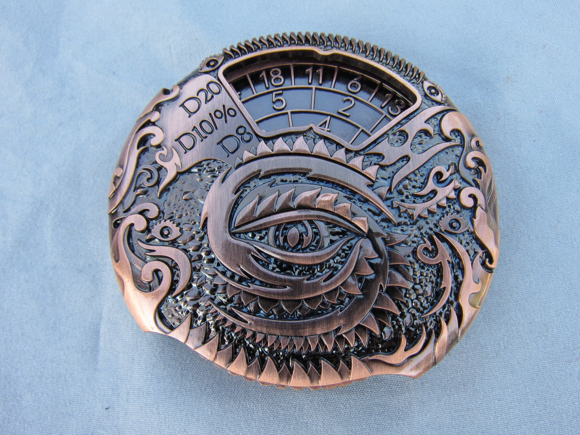 A gorgeous dragon on either side of this double sided spinner guards your rolls.