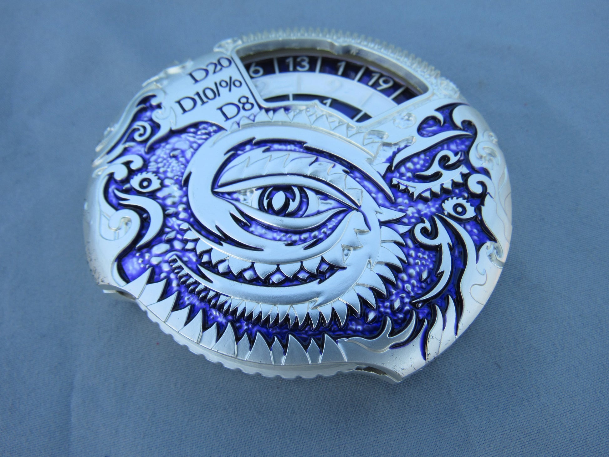 A gorgeous dragon on either side of this double sided spinner guards your rolls.