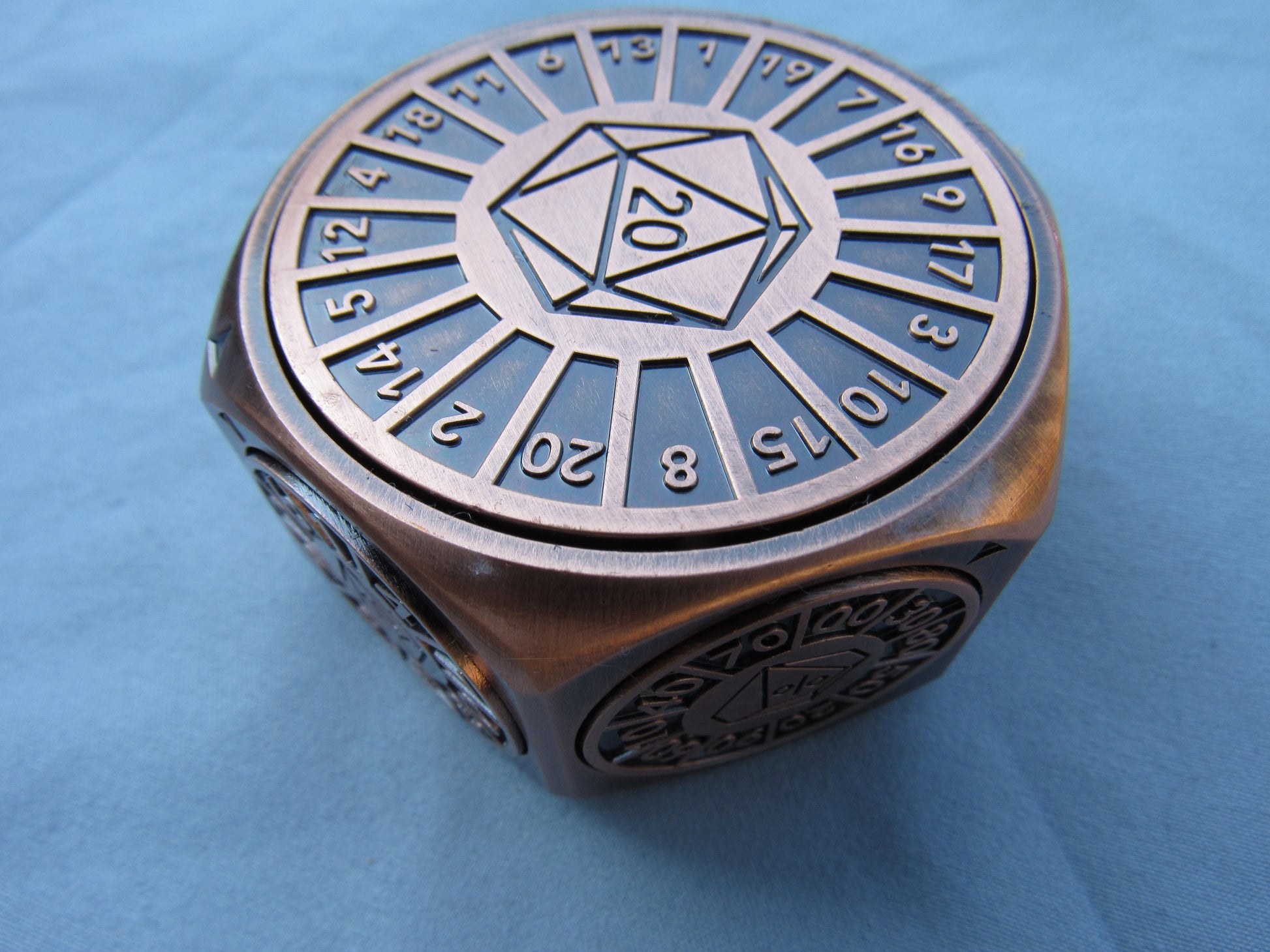 A hefty puck spinner in the shape of a hexagon. The small sides each have one standard D&D die on a wheel, with the top containing the d20. The bottom has a wheel of the standard character classes, for all of your NPC and DM-ing needs!