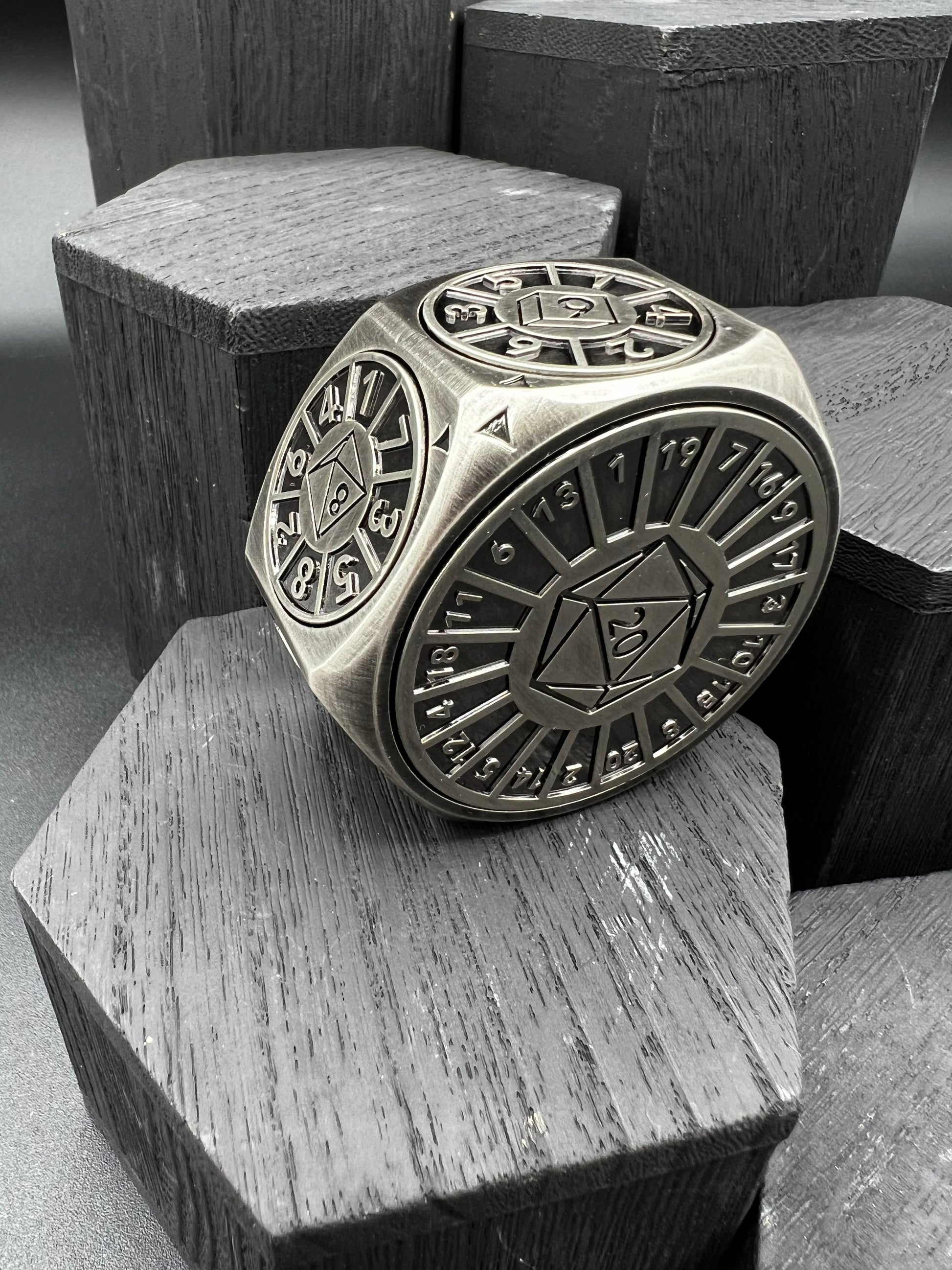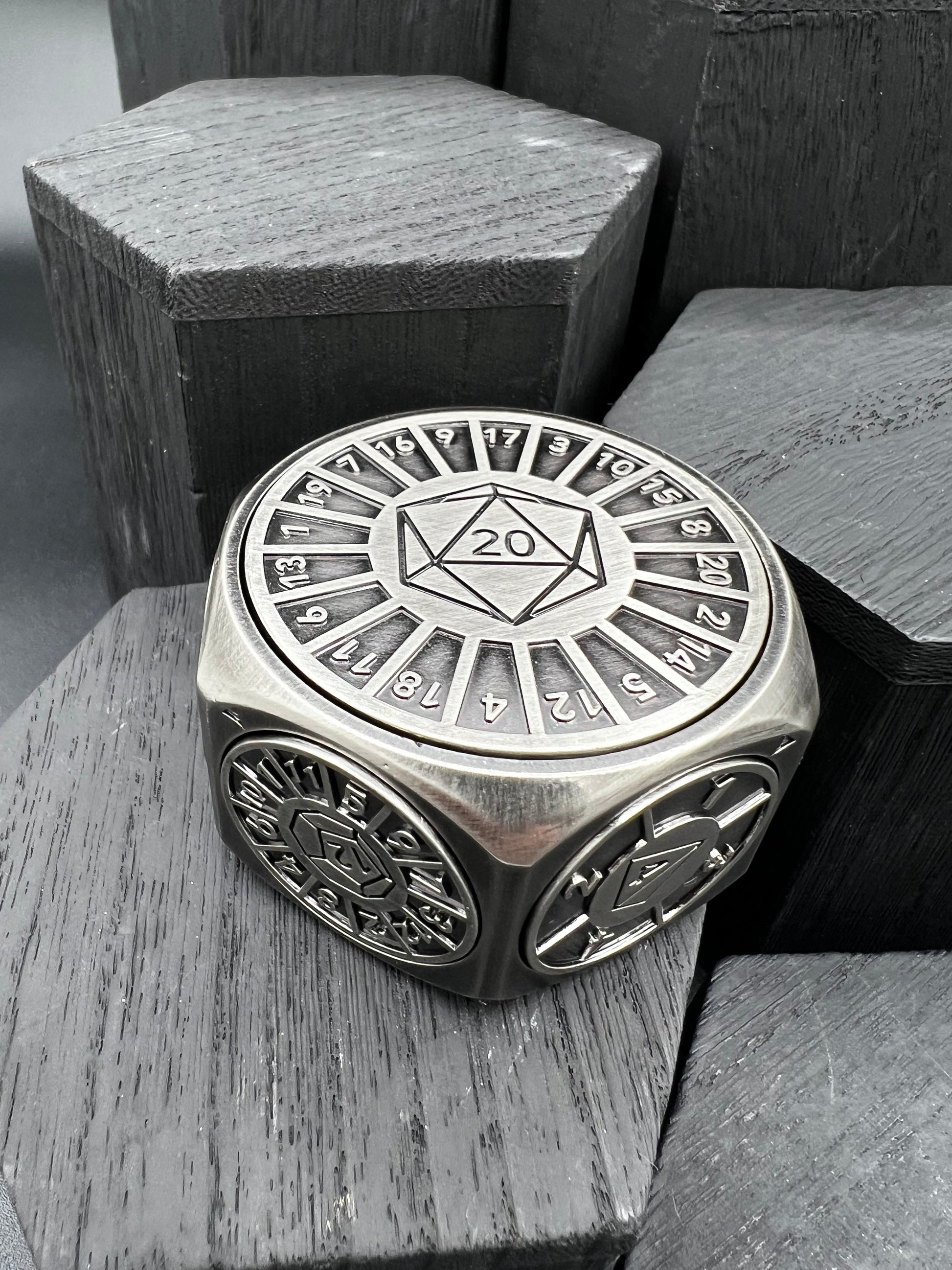 A hefty puck spinner in the shape of a hexagon. The small sides each have one standard D&D die on a wheel, with the top containing the d20. The bottom has a wheel of the standard character classes, for all of your NPC and DM-ing needs!