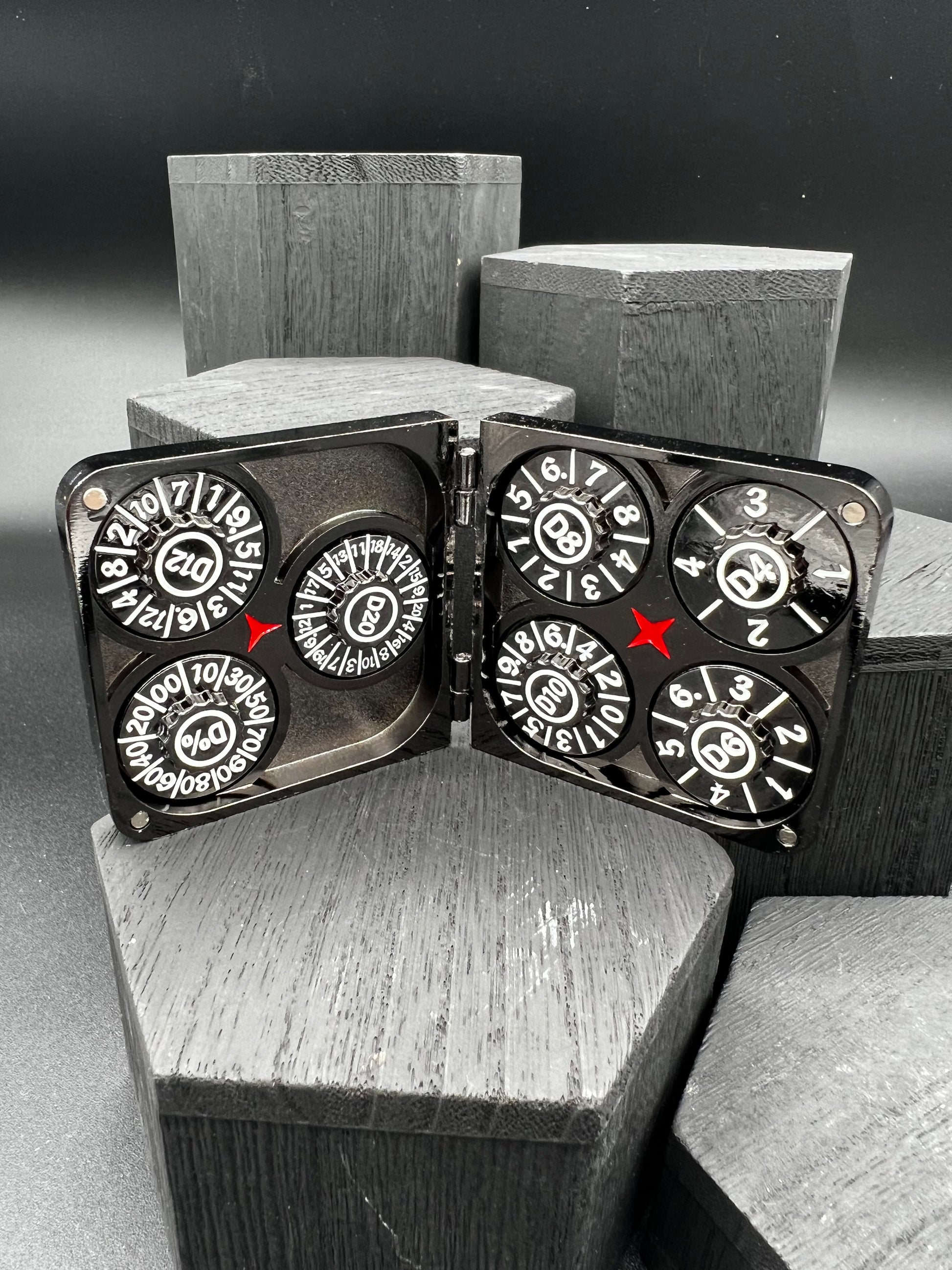 For players on the go! This compact set of spinning dice is the size of a small wallet. It folds and snaps shut to keep all of the wheels safe, with a fierce dragon guarding your rolls!