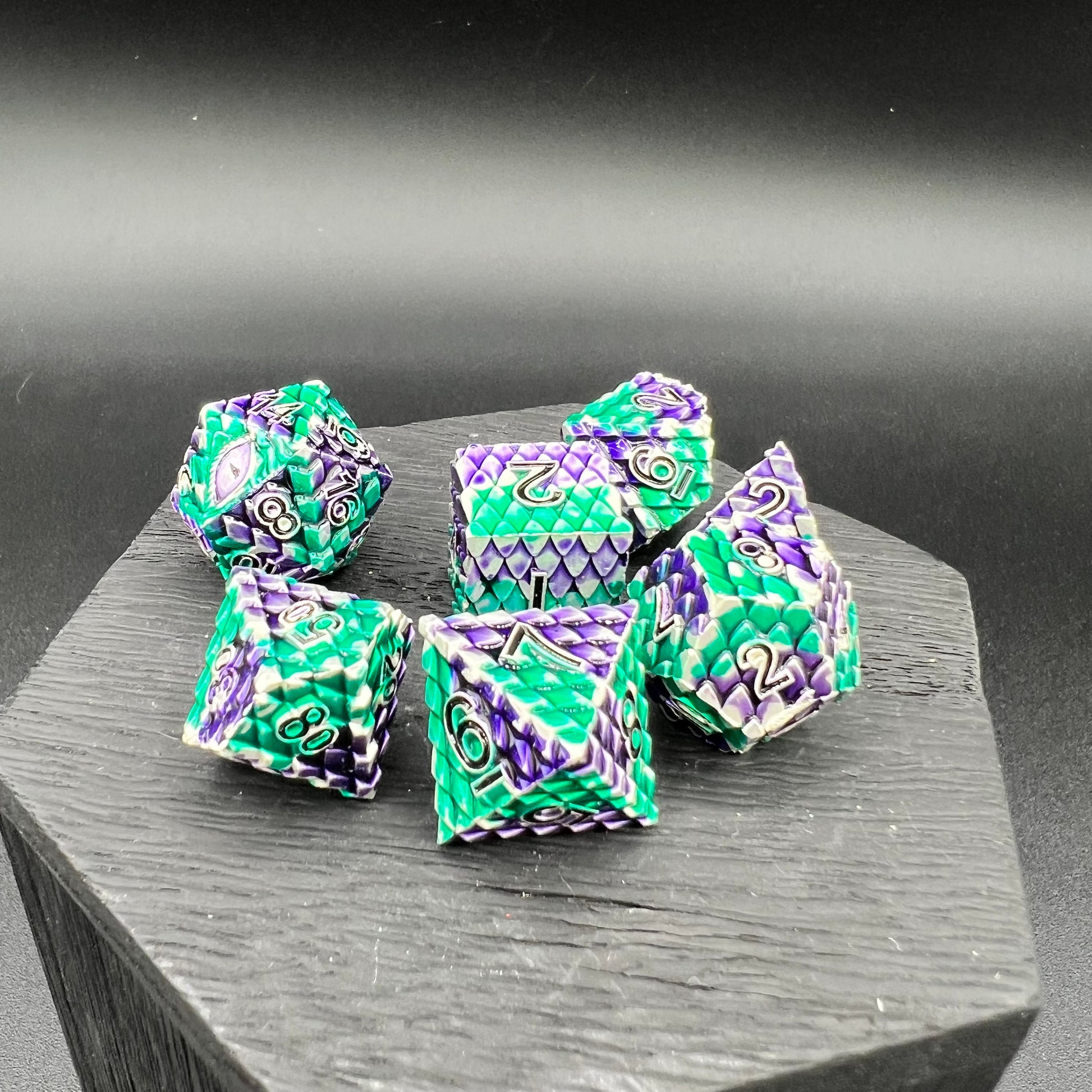 Our premium zinc alloy metal is precisely crafted into a high-relief dragon scale texture with a striking eye on the d20. Bold numerals make these easy to read during your intense battles!