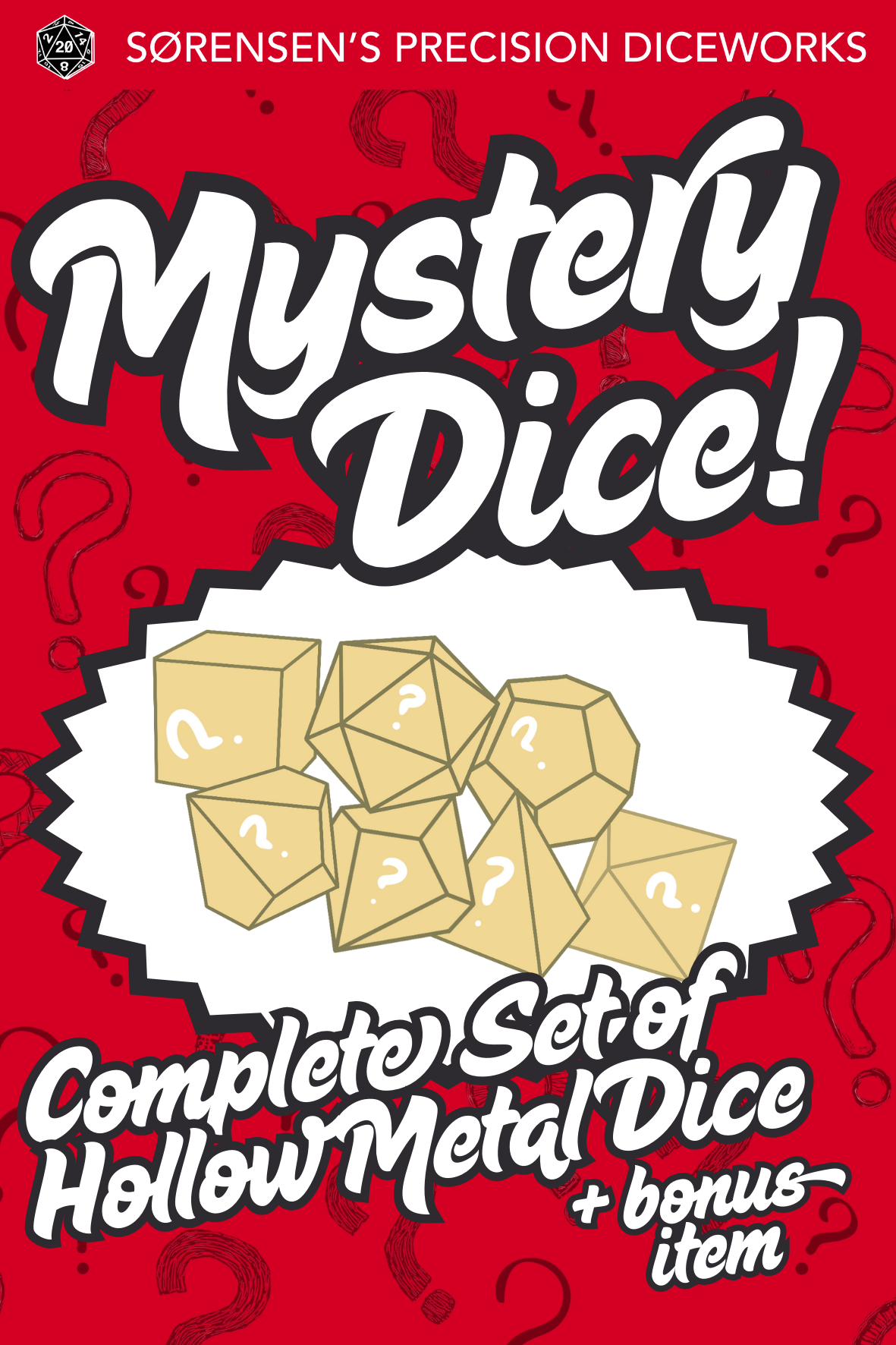 Includes 1 full set of hollow metal dice + a bonus item (D&D pin!) in a giftable bag!