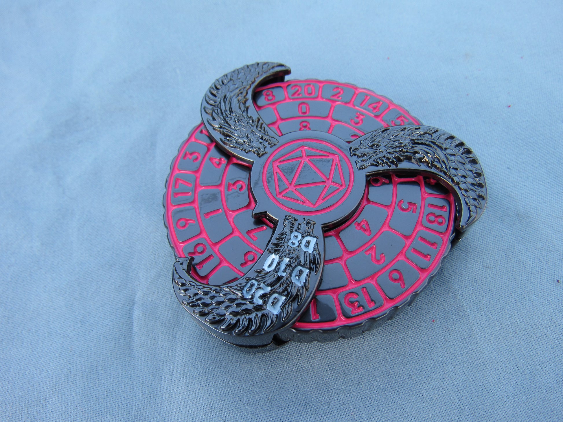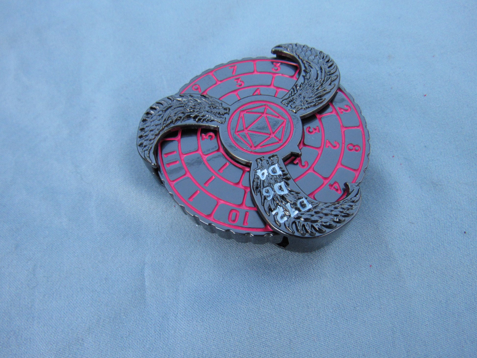 3 dials on either side have the standard D&D dice. Fits nicely in your hand just like a fidget spinner