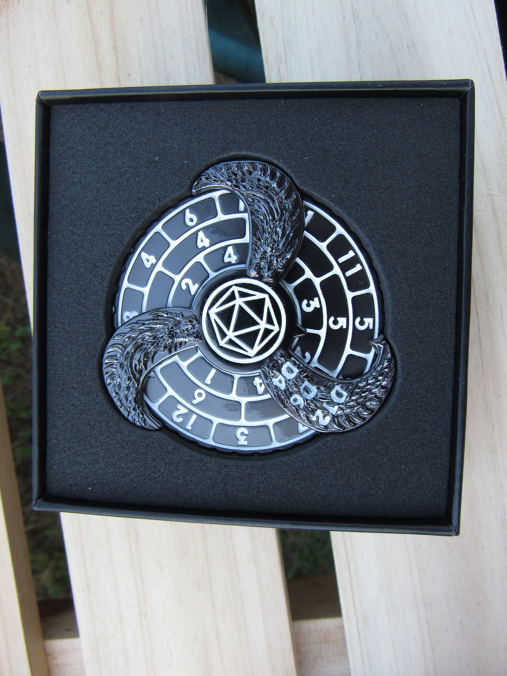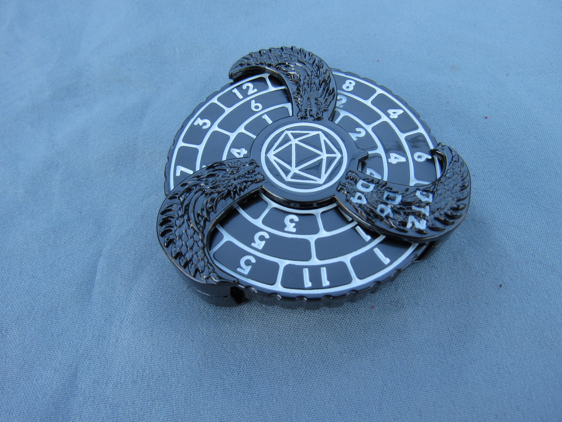 3 dials on either side have the standard D&D dice. Fits nicely in your hand just like a fidget spinner