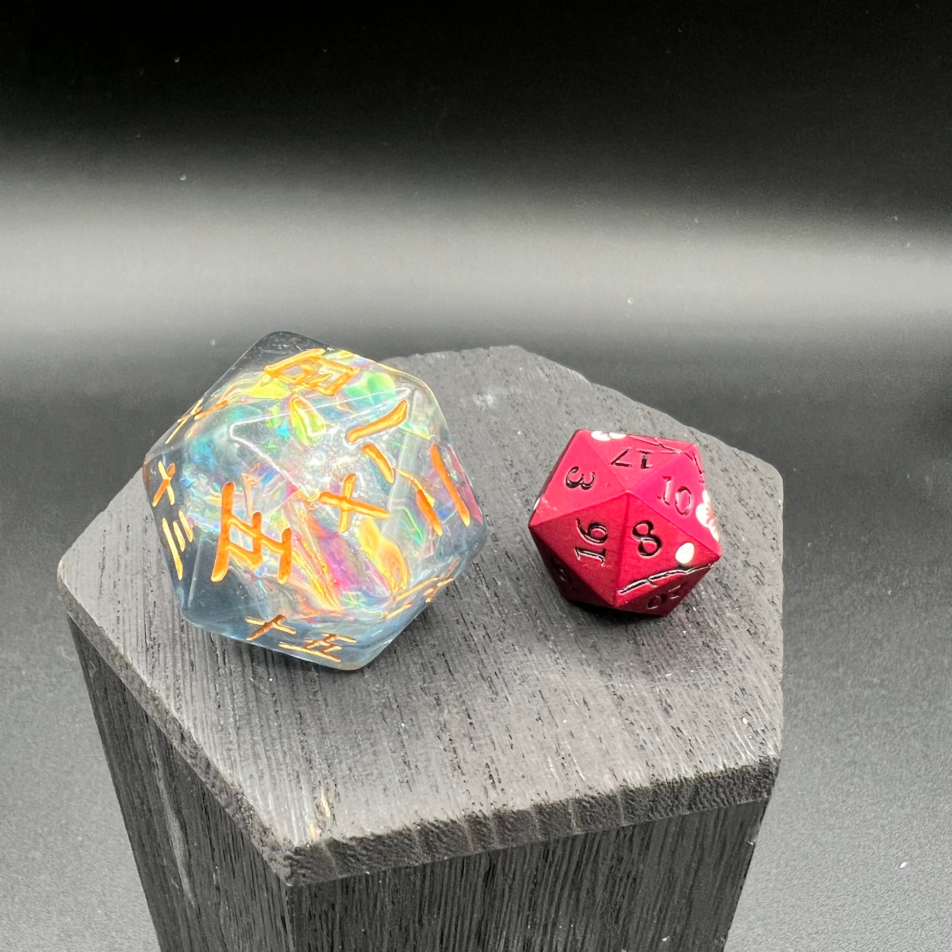 Cast in acrylic, this sparkly d20 features kanji numbers on each face. Oversized at 33mm!