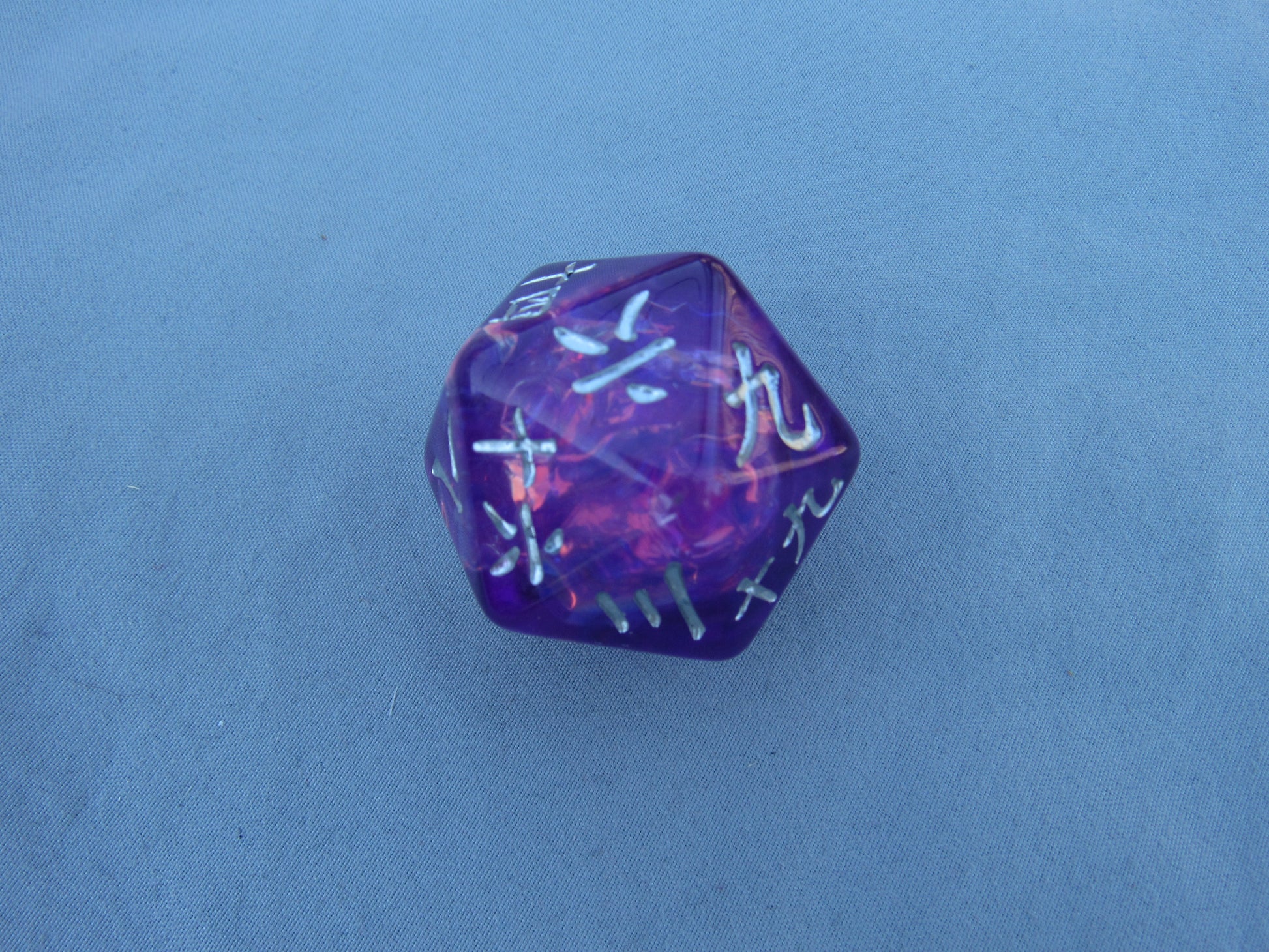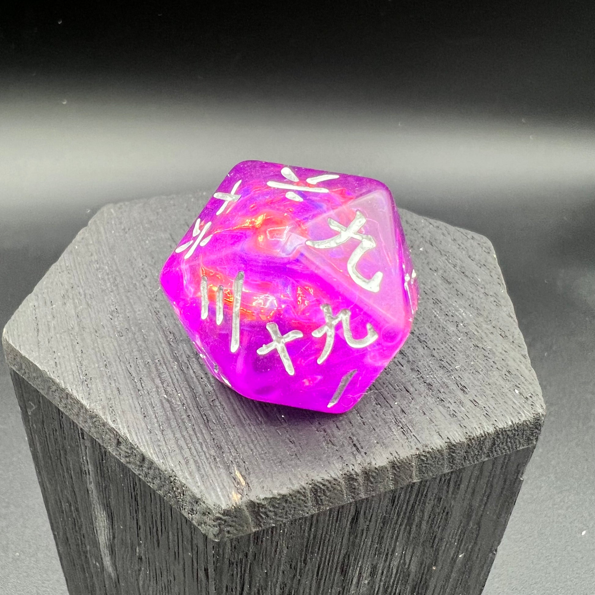 Cast in acrylic, this sparkly d20 features kanji numbers on each face. Oversized at 33mm!