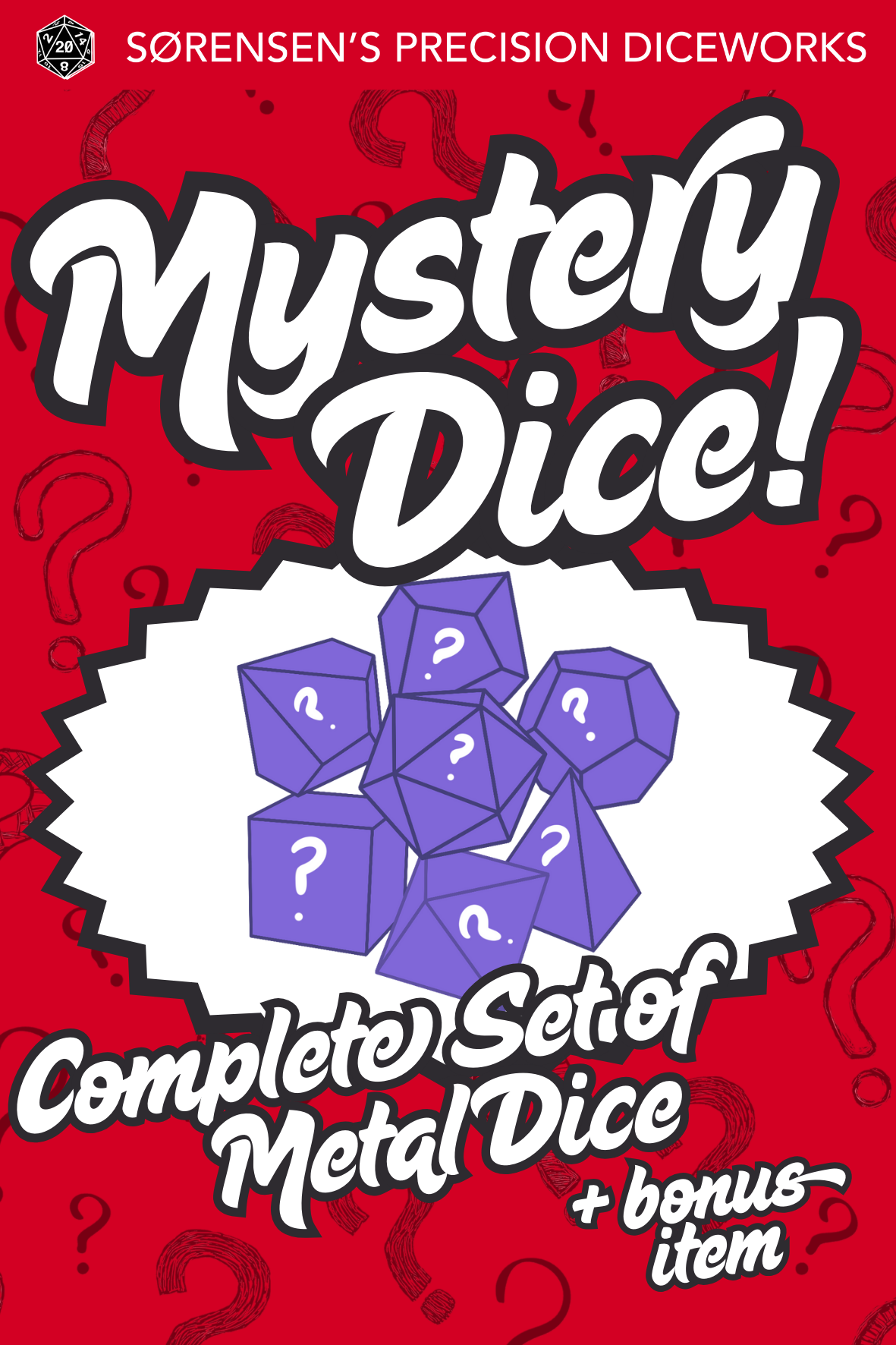 Includes 1 full set of solid metal dice + a bonus item (D&D pin!) in a giftable bag!