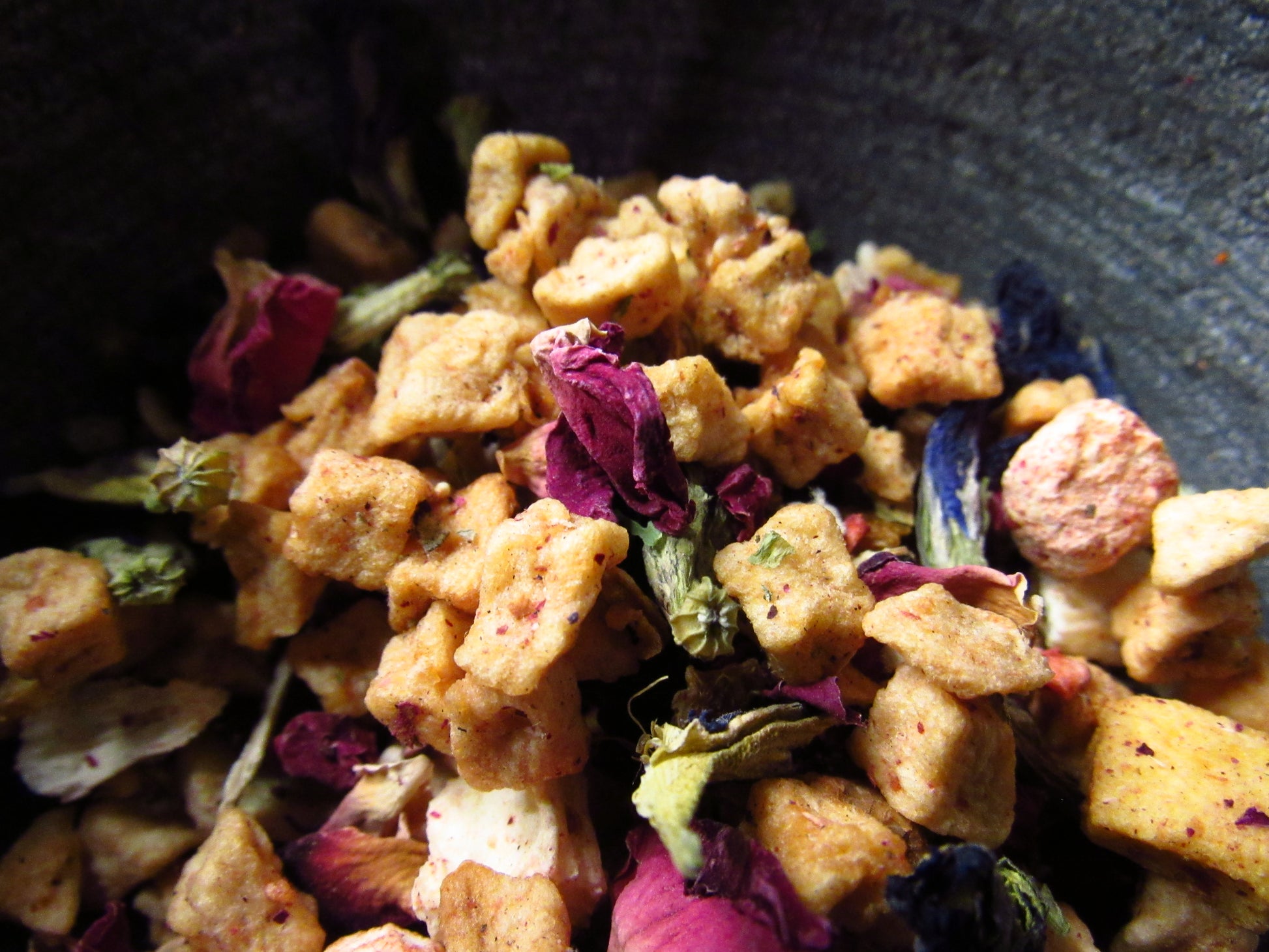 Ingredients: apple pieces, butterfly pea flower, orange, mullein leaf, lemon verbena, peach pieces, rose hips, pineapple pieces, mango pieces, chamomile, rose petals, strawberries, natural peach flavor, natural papaya flavor