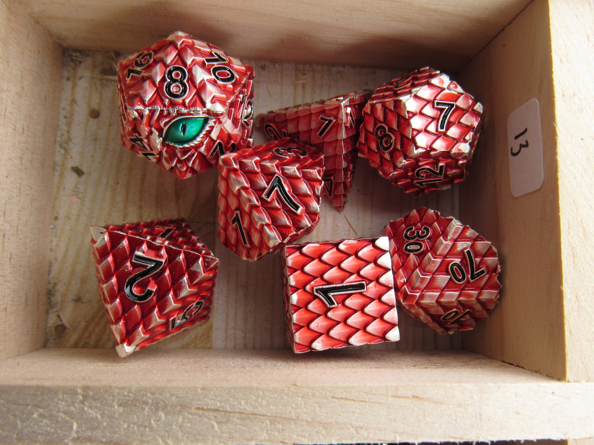 Our premium zinc alloy metal is precisely crafted into a high-relief dragon scale texture with a striking eye on the d20. Bold numerals make these easy to read during your intense battles!