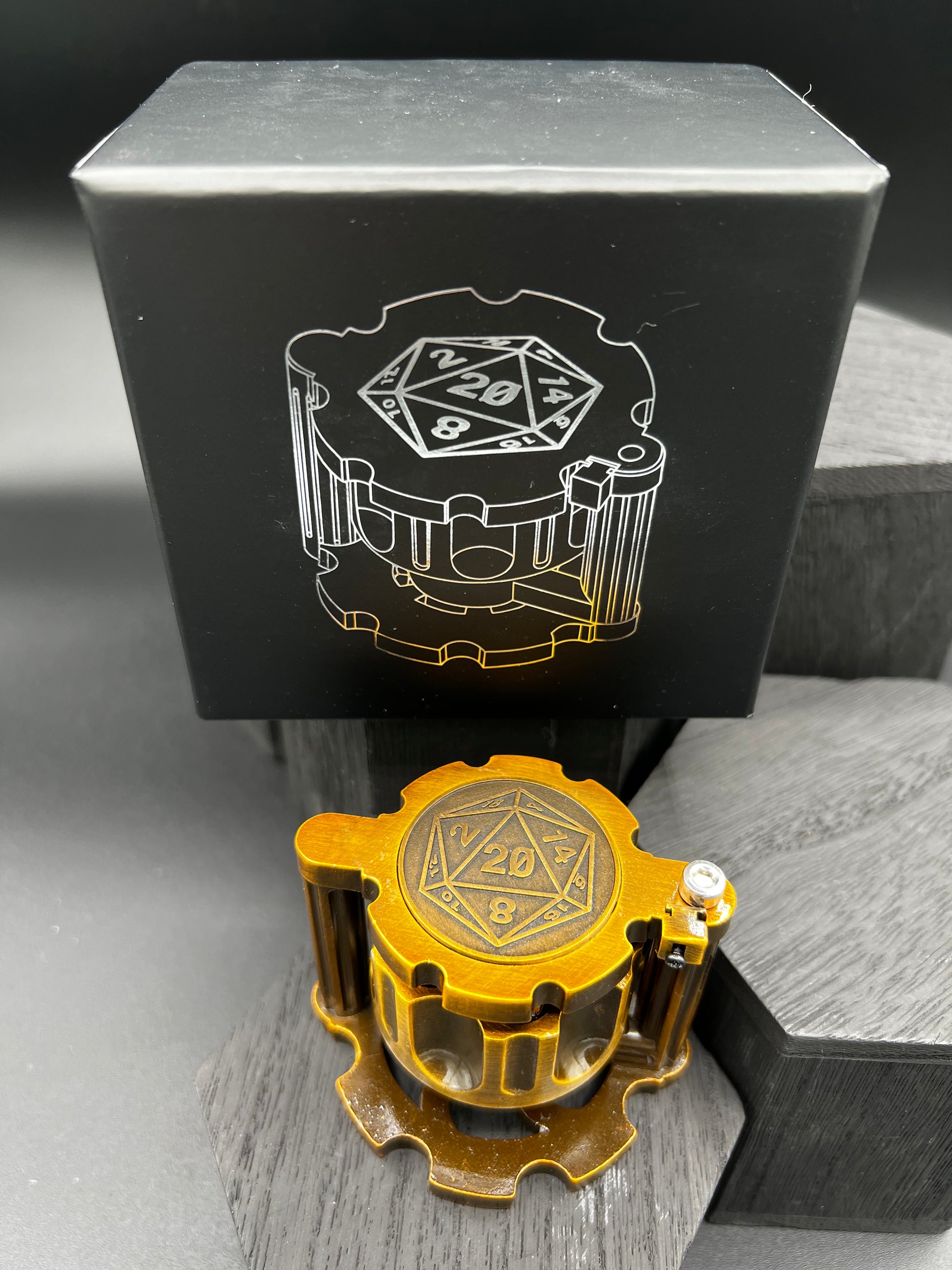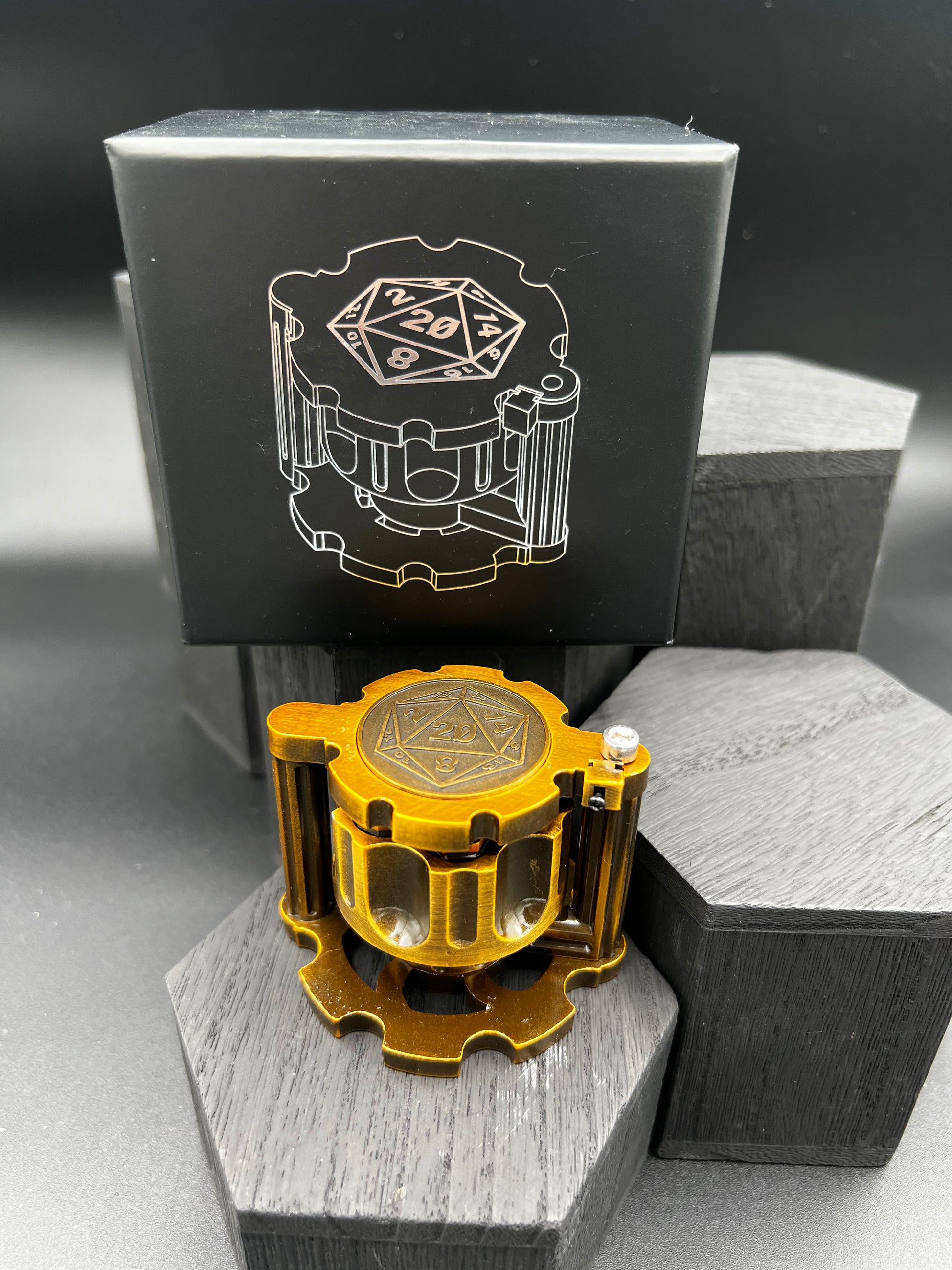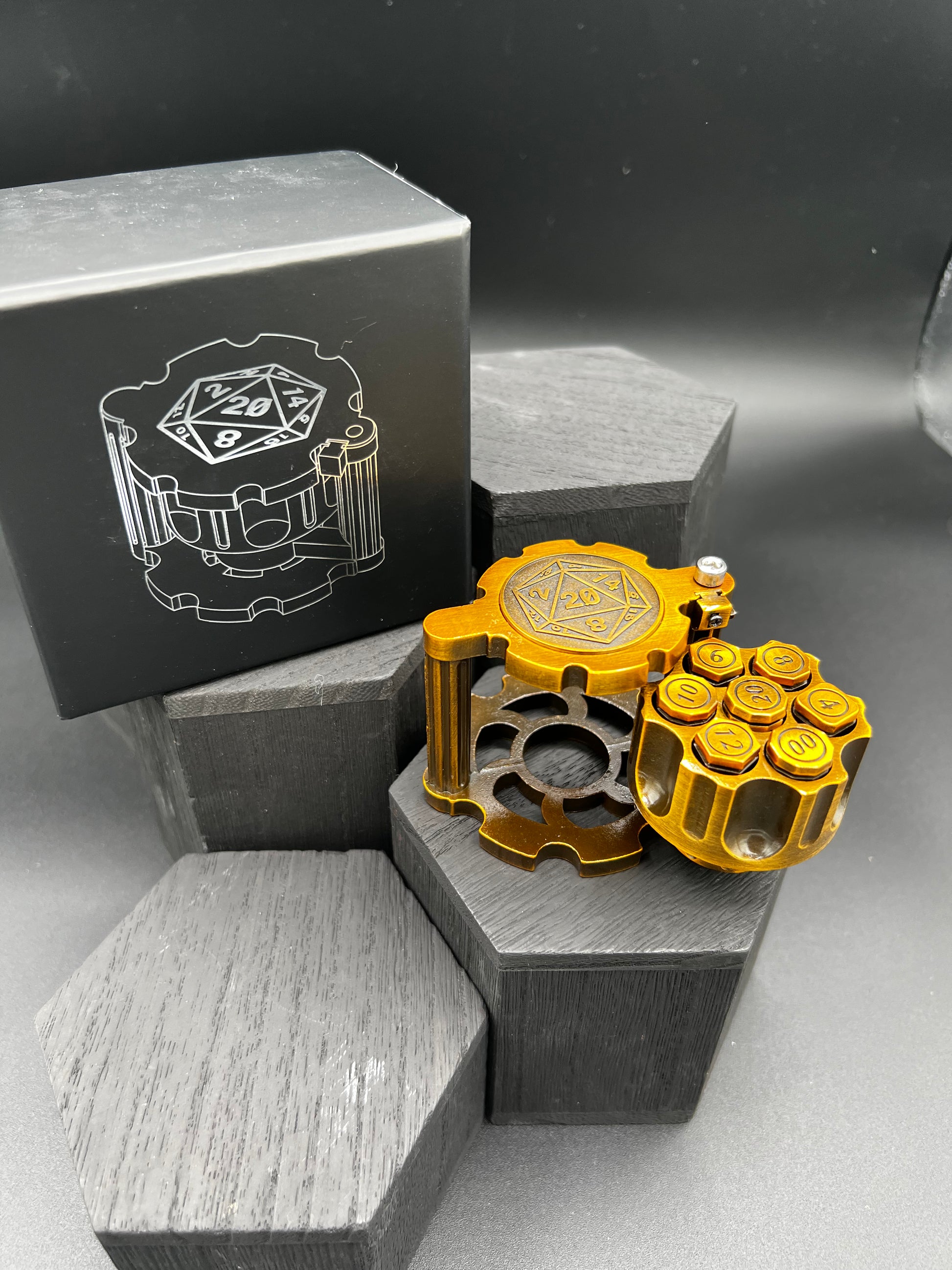 A complete set of seven metal dice in the form of bullets. The caliber is stamped on the end (d4, d6, d10, etc.) Click on the safety to lock the chamber in place, and spin!